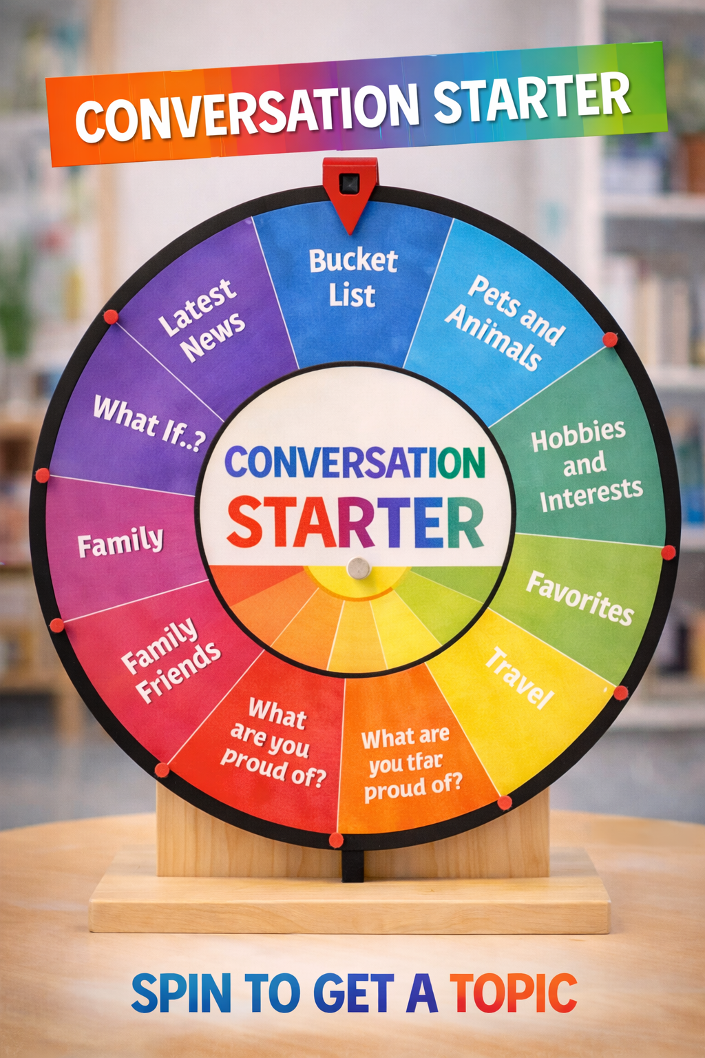 The Conversation Starter Wheel works well in classrooms, workshops, networking events, onboarding sessions, youth groups, team-building exercises, and casual gatherings. It can be used at the beginning of a session to warm people up, in the middle to re-energize the group, or at the end to encourage reflection. The spinning format also makes the process more interactive and engaging than pulling topics from a printed list.