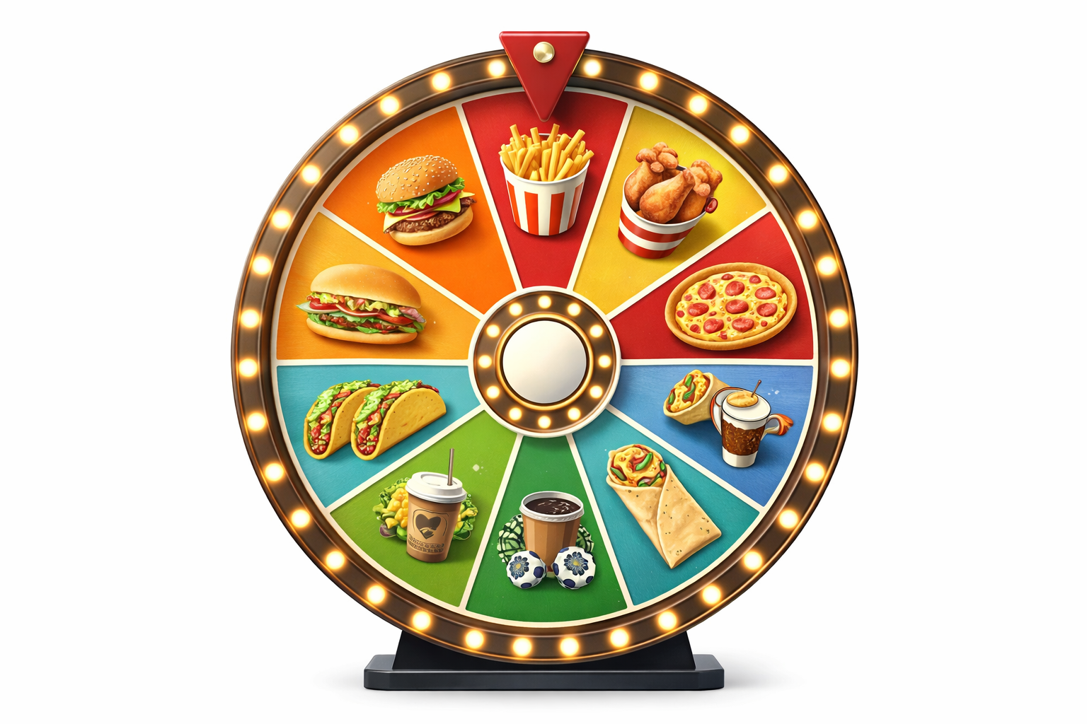 For the best experience, include realistic fast food options you actually order and enjoy. A mix of burgers, chicken, fries, wraps, tacos, and other favorites makes the wheel more useful and more fun. Add your go-to choices, spin once, and pick your order in seconds.