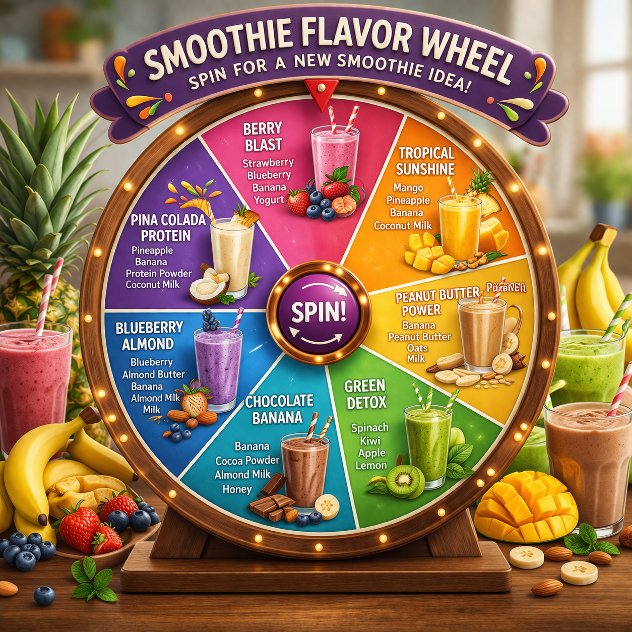 Smoothies are simple, but choosing the flavor can still take longer than expected when you have fruit, yogurt, milk, protein powder, and extras sitting in front of you. This wheel solves that by turning your options into a fast random picker. Instead of making the same blend every time or standing in the kitchen debating between sweet, creamy, or refreshing combinations, you can spin once and let the wheel guide your next mix.
